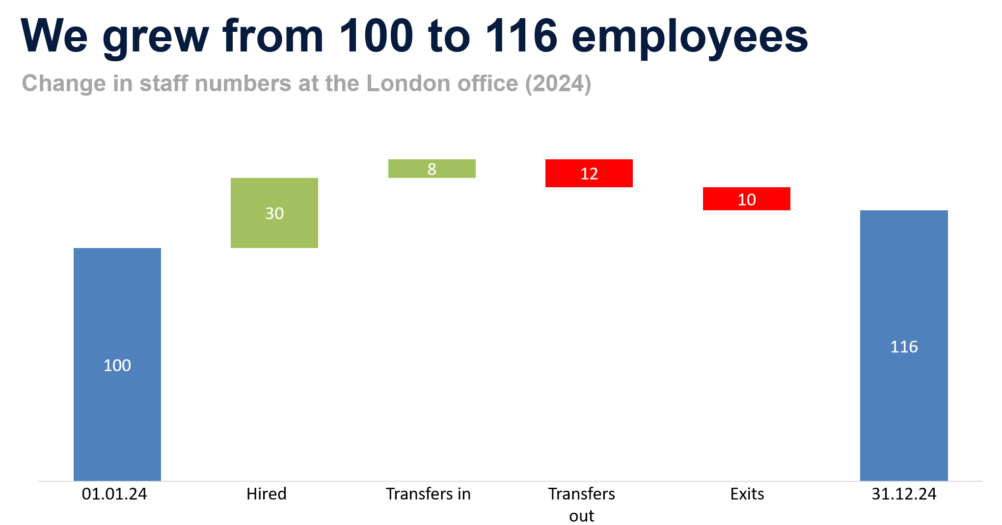 Bridge chart showing the components of change between start and end value.